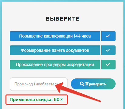 Не забудьте применить промокод! Его нужно ввести и нажать кнопку "Проверить". Должна появиться надпись о применении скидки. Промокодом с вами может поделиться коллега, который дал рекомендацию, либо специалист нашей компании.