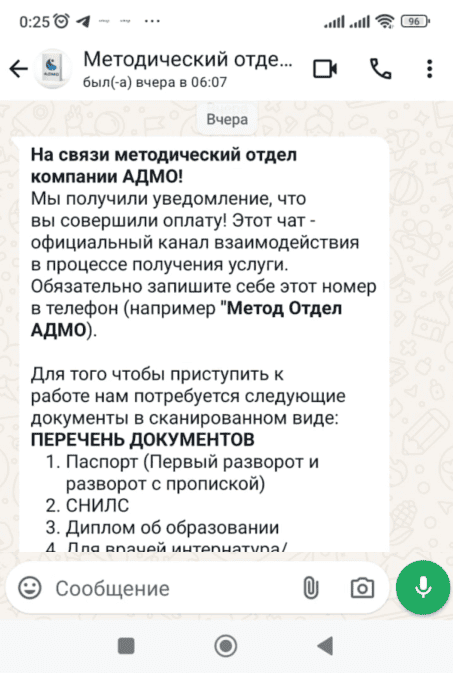Сразу после оплаты на ваш WhatsApp придет авто-сообщение с номера методического отдела. Для того чтобы начать работу по вашей заявке нам нужно получить от вас перечисленные там документы. Это можно сделать ответным сообщением в тот же чат, либо на электронную почту, которая указана в автосообщении. После этого мы сразу же приступим к работе. Процесс выполнения вы сможете видеть в личном кабинете, об этом ниже.
