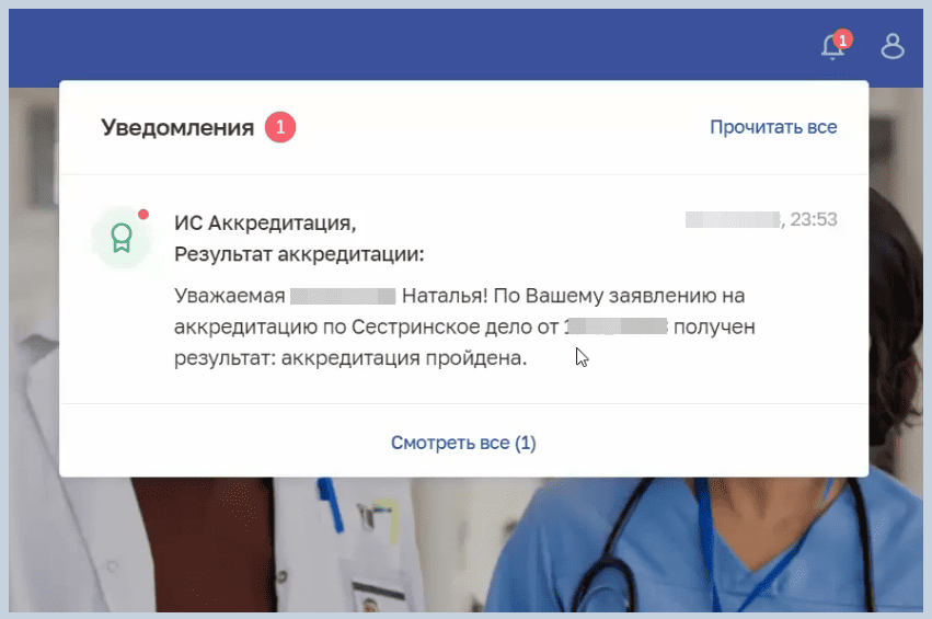 После того как мы сделаем все неоходимое, вы получите отметку о прохождении аккредитации. Вы сразу увидите информацию об этом в виде уведомления на портале ФРМР.